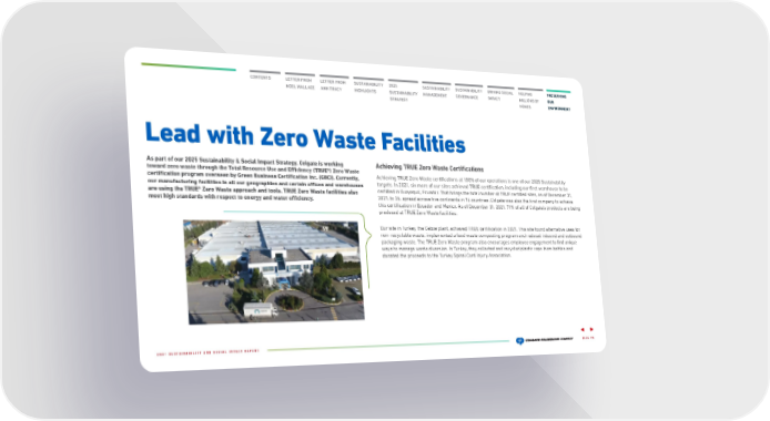 CONTENTS LETTER FROM NOEL WALLACE LETTER FROM ANN TRACY 2025 SUSTAINABILITY STRATEGY SUSTAINABILITY HIGHLIGHTS SUSTAINABILITY MANAGEMENT SUSTAINABILITY GOVERNANCE DRIVING SOCIAL IMPACT HELPING MILLIONS OF HOMES PRESERVING OUR ENVIRONMENT Lead with Zero Waste Facilities As part of our 2025 Sustainability & Social Impact Strategy, Colgate is working toward zero waste through the Total Resource Use and Efficiency (TRUE®) Zero Waste certification program overseen by Green Business Certification Inc. (GBCI). Currently, our manufacturing facilities in all our geographies and certain offices and warehouses are using the TRUE® Zero Waste approach and tools. TRUE Zero Waste facilities also meet high standards with respect to energy and water efficiency. Achieving TRUE Zero Waste Certifications Achieving TRUE Zero Waste certifications at 100% of our operations is one of our 2025 Sustainability targets. In 2021, six more of our sites achieved TRUE certification, including our first warehouse to be certified in Guayaquil, Ecuador. That brings the total number of TRUE certified sites, as of December 31, 2021, to 26, spread across five continents in 16 countries. Colgate was also the first company to achieve this certification in Ecuador and Mexico. As of December 31, 2021, 71% of all of Colgate’s products are being produced at TRUE Zero Waste facilities. Our site in Turkey, the Gebze plant, achieved TRUE certification in 2021. This site found alternative uses for non-recyclable wast e, implemented a food waste composting program and reduced inbound and outbound packaging waste. The TRUE Zero Waste program also encourages employee engagement to find unique ways to manage waste diversion. In Turkey, they collected and recycled plastic caps from bottles and donated the proceeds to the Turkey Spinal Cord Injury Association. PAGE 70 2021 SUSTAINABILITY AND SOCIAL IMPACT REPORT