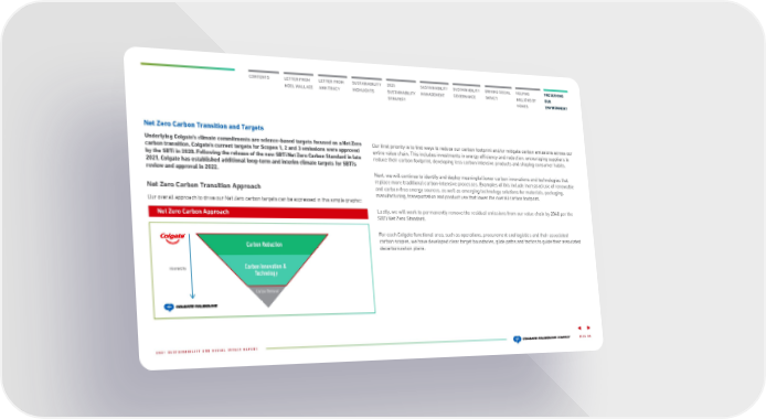 CONTENTS LETTER FROM NOEL WALLACE LETTER FROM ANN TRACY 2025 SUSTAINABILITY STRATEGY SUSTAINABILITY HIGHLIGHTS SUSTAINABILITY MANAGEMENT SUSTAINABILITY GOVERNANCE DRIVING SOCIAL IMPACT HELPING MILLIONS OF HOMES PRESERVING OUR ENVIRONMENT Net Zero Carbon Transition and Targets Underlying Colgate’s climate commitments are science-based targets focused on a Net Zero carbon transition. Colgate’s current targets for Scopes 1, 2 and 3 emissions were approved by the SBTi in 2020. Following the release of the new SBTi Net Zero Carbon Standard in late 2021, Colgate has established additional long-term and interim climate targets for SBTi’s review and approval in 2022. Net Zero Carbon Transition Approach Our overall approach to drive our Net Zero carbon targets can be expressed in this simple graphic: Net Zero Carbon Approach Hierarchy Carbon Reduction Carbon Innovation & Technology Carbon Removal Our first priority is to find ways to reduce our carbon footprint and/or mitigate carbon emissions across our entire value chain. This includes investments in energy efficiency and reduction, encouraging suppliers to reduce their carbon footprint, developing less carbon intensive products and shaping consumer habits. Next, we will continue to identify and deploy meaningful lower carbon innovations and technologies that replace more traditi onal carbon-intensive processes. Examples of this include increased use of renewable and carbon-free energy sources, as well as emerging technology solutions for materials, packaging, manufacturing, transportation and product use that lower the overall carbon footprint. Lastly, we will work to permanently remove the residual emissions from our value chain by 2040 per the SBTi Net Zero Standard . For each Colgate functional area, such as operations, procurement and logistics and their associated carbon scopes, we have d eveloped clear target boundaries, glide paths and tactics to guide their associated decarbonization plans. PAGE 58 2021 SUSTAINABILITY AND SOCIAL IMPACT REPORT