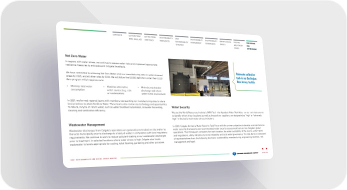 CONTENTS LETTER FROM NOEL WALLACE LETTER FROM ANN TRACY 2025 SUSTAINABILITY STRATEGY SUSTAINABILITY HIGHLIGHTS SUSTAINABILITY MANAGEMENT SUSTAINABILITY GOVERNANCE DRIVING SOCIAL IMPACT HELPING MILLIONS OF HOMES PRESERVING OUR ENVIRONMENT Net Zero Water In regions with water stress, we continue to assess water risks and implement appropriate resilience measures to anticipate and mitigate the effects. We have committed to achieving Net Zero Water at all our manufacturing sites in water stressed areas by 2025, and all ot her sites by 2030. We will follow the USGBC definition under their LEED Zero program which requires us to: • M inimize total water consumption • Maximize a lternative water sources (e.g. , rain or condensation) • Minimize wastewater discharge and retur n water to the environment In 2021, we formed regional teams with members representing our manufacturing sites to share best practices to att ain Net Zero Water. These teams also review any technology and opportunities to reduce, recycle or return water, such as water treatment automation, rainwater harvesting, cleaning and sanitization efficiency. W astewater Management W astewater discharges from Colgate’s operations are generally pre-treated on site and/or by the local municipali ty prior to discharge to a body of water, in compliance with local regulatory requirements. We continue to work to reduce pollutant-loading in our wastewater discharges prior to treatment. In selected locations where water stress is high, Colgate also treats wastewater to levels appropriate for cooling, toilet flushing, gardening and other purposes. Rainwater collection tank in our Burlington, New Jersey, facility Water Security PAGE 75 2021 SUSTAINABILITY AND SOCIAL IMPACT REPORT We use the World Resources Institute’s (WRI) Tool—the Aqueduct Water Risk Atlas—as our main data source to identify which of our locations as well as those of our suppliers, are designated as “high” or “extremely high” in the tool’s main water stress indicators. In 2021, Colgate formed a Water Security Task Force with the primary objective to develop a comprehensive water security framework and recommended water security assessment tools across Colgate’s global operations. This framework considers, for each location, the water availability at the source, water rights and regulations, utility infrastructure and reliability and local water governance. The task force is composed of representatives from the following functions: sustainability, manufacturing, engineering, facilities, risk management and legal.