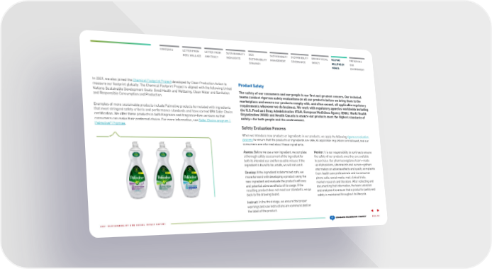 CONTENTS LETTER FROM NOEL WALLACE LETTER FROM ANN TRACY 2025 SUSTAINABILITY STRATEGY SUSTAINABILITY HIGHLIGHTS SUSTAINABILITY MANAGEMENT SUSTAINABILITY GOVERNANCE DRIVING SOCIAL IMPACT HELPING MILLIONS OF HOMES PRESERVING OUR ENVIRONMENT In 2021, we also joined the Chemical Footprint Project developed by Clean Production Action to measure our footpri nt globally. The Chemical Footprint Project is aligned with the following United Nations Sustainable Development Goals: Good Health and Wellbeing, Clean Water and Sanitation and Responsible Consumption and Production. Examples of more sustainable products include Palmolive products formulated with ingredients that meet stringent s afety criteria and performance standards and have earned EPA Safer Choice certification. We offer these products in both fragrance and fragrance-free versions so that consumers can make their preferred choice. For more information, see Safer Choice program | Palmolive® Promise. Product Safety The safety of our consumers and our people is our first and greatest concern. Our technical teams conduct rigorous safety evaluations on all our products before we bring them to the marketplace and ensure our products comply with, and often exceed, all applicable regulatory requirements wherever we do business. We work with regulatory agencies worldwide including the U.S. Food and Drug Administration (FDA), European Medicines Agency (EMA), World Health Organization (WHO) and Health Canada to ensure our products meet the highest standards of safety—for both people and the environment. Safety Evaluation Process When we introduce new products or ingredients in our products, we apply the following rigorous evaluation process to ensure tha t the products or ingredients are safe, all applicable regulations are followed, and our consumers are info rmed about these ingredients. Assess: Before we use a new ingredient, we complete a thorough safety ass essment of the ingredient for both its intended use and foreseeable misuse. If the ingredient is found to be unsafe, we will not use it. Develop: If the ingredient is determined safe, we move forward with dev eloping a product using the new ingredient and evaluate the product’s efficacy and potential adverse effects of its usage. If the resulting product does not meet our standards, we go back to the drawing board. Instruct: In the third stage, we ensure that proper warnings and use ins tructions are communicated on the label of the product. Monitor: It is our responsibility to continue to ensure the safety of our prod ucts once they are available to purchase. Our pharmacovigilance team—made up of physicians, pharmacists and nurses—gathers information on adverse effects and quality complaints from health care professionals and via consumer phone calls, social media, mail, clinical trials, market research and literature. After collecting and documenting that information, the team assesses and analyzes it to ensure that a product’s quality and safety is maintained throughout its lifecycle. PAGE 47 2021 SUSTAINABILITY AND SOCIAL IMPACT REPORT