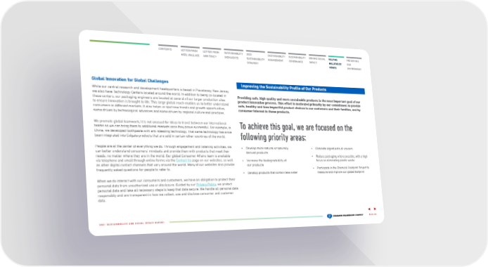 CONTENTS LETTER FROM NOEL WALLACE LETTER FROM ANN TRACY 2025 SUSTAINABILITY STRATEGY SUSTAINABILITY HIGHLIGHTS SUSTAINABILITY MANAGEMENT SUSTAINABILITY GOVERNANCE DRIVING SOCIAL IMPACT HELPING MILLIONS OF HOMES PRESERVING OUR ENVIRONMENT Global Innovation for Global Challenges While our central research and development headquarters is based in Piscataway, New Jersey, we also have Technology Centers located around the world. In addition to being co-located in these centers, our packaging engineers are located at several of our larger production sites to ensure innovation is brought to life. This large global reach enables us to better understand consumers in different markets. It also helps us spot new trends and growth opportunities, some driven by technological advances and some driven by regional culture and practices. We promote global teamwork; it is not unusual for ideas to travel between our international teams so we can bring them to a dditional markets once they prove successful. For example, in China, we developed toothpaste with anti-bleeding technology. That same technology has since been integrated into Colgate products that are sold in certain other countries of the world. People are at the center of everything we do. Through engagement and listening activities, we can better understand c onsumers’ mindsets and provide them with products that meet their needs, no matter where they are in the world. Our global Consumer Affairs team is available via telephone and email through online forms via the Contact Us page on our websites, as well as other digital contac t channels that vary around the world. Many of our websites also provide frequently asked questions for people to refer to. When we do interact with our consumers and customers, we have an obligation to protect their personal data from unau thorized use or disclosure. Guided by our Privacy Policy , we protect personal data and take al l necessary steps to keep that data secure. We handle all personal data responsibly and are transparent in how we collect, use and disclose consumer and customer data. Improving the Sustainability Profile of Our Products Providing safe, high quality and more sustainable products is the most important goal of our product innovation process. This effort is motivated primarily by our commitment to provide safe, healthy and less impactful product choices to our customers and their families, and by consumer interest in these products. To achieve this goal, we are focused on the following priority areas: • Develop more natural or naturally derived products • Incr ease the biodegradability of our products • Develop pr oducts that contain less water • Eliminate ingredients of concern • Reduce packaging where possible, with a high focus on eliminating pla stic waste • Participate in the Chemical Footprint Project to measure and improve our g lobal footprint PAGE 43 2021 SUSTAINABILITY AND SOCIAL IMPACT REPORT
