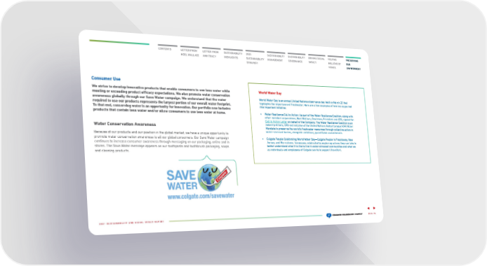 CONTENTS LETTER FROM NOEL WALLACE LETTER FROM ANN TRACY 2025 SUSTAINABILITY STRATEGY SUSTAINABILITY HIGHLIGHTS SUSTAINABILITY MANAGEMENT SUSTAINABILITY GOVERNANCE DRIVING SOCIAL IMPACT HELPING MILLIONS OF HOMES PRESERVING OUR ENVIRONMENT Consumer Use W e strive to develop innovative products that enable consumers to use less water while meeting or exceeding product effi cacy expectations. We also promote water conservation awareness globally through our Save Water campaign. We understand that the water required to use our products represents the largest portion of our overall water footprint. To that end, conserving water is an opportunity for innovation. Our portfolio now includes products that contain less water and/or allow consumers to use less water at home. Water Conservation Awareness Because of our products and our position in the global market, we have a unique opportunity to promote water conservation awareness to all our global consumers. Our Save Water campaign continues to increase consumer awareness through messaging on our packaging, online and in stores. The Save Water message appears on our toothpaste and toothbrush packaging, soaps and cleaning products. World Water Day World Water Day is an annual United Nations observance day held on March 22 that highlights the importance of freshwater. Here are a few examples of how we supported this important initiative: • Water Resilience Call to Action: As part of the Water Resilience Coalition, along with other member corporat ions, Noel Wallace, Chairman, President and CEO, signed the Call to Action Letter on behalf of the Company. The Water Resilience Coalition is an industry-driven, CE O-led initiative of the United Nations Global Compact CEO Water Mandate to preserve the world’s freshwater resources through collective action in water-stressed basins, alongside ambitious, quantifiable commitments. • Colgate People Celebrating World Water Day—Colgate People in Piscataway, New Jersey, and Morristown , Tennessee, celebrated by exploring actions they can take to better understand what it is like to live in water-stressed communities and what we as individuals and employees of Colgate can do to support this effort. PAGE 76 2021 SUSTAINABILITY AND SOCIAL IMPACT REPORT