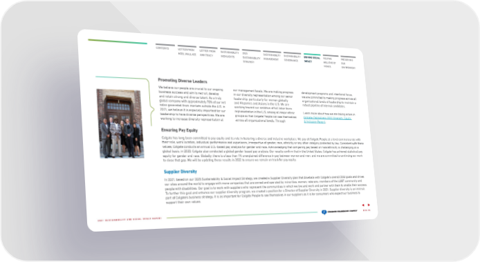 CONTENTS LETTER FROM NOEL WALLACE LETTER FROM ANN TRACY 2025 SUSTAINABILITY STRATEGY SUSTAINABILITY HIGHLIGHTS SUSTAINABILITY MANAGEMENT SUSTAINABILITY GOVERNANCE DRIVING SOCIAL IMPACT HELPING MILLIONS OF HOMES PRESERVING OUR ENVIRONMENT Promoting Diverse Leaders We believe our people are cr ucial to our ongoing business success and aim to rec ruit, develop and retain strong and diverse talent. As a truly global company with approximately 70% of our net sales generated from markets outside the U.S. in 2021, we believe it is especially important for our leadership to have diverse perspectives. We are working to increase diversity representation at our management levels. We are making progress in our diversity represe ntation among our senior leadership, particularly for women globally and Hispanics and Asians in the U.S. We are working toward our ambition of full labor force representation in the U.S. among all major ethnic groups so that Colgate People can see themselves across all organizational levels. Through development programs and intentional focus, we are committed to making p rogress across all organizational levels of leadership to maintain a robust pipeline of internal candidates. Learn more about how we are t aking action in Colgate-Palmolive's 2022 Diversity, Equity & Inclusion Report . Ensuring Pay Equity Colgate has long been committed to pay equity and its role in fostering a diverse and inclusive workplace. We pay all Colgate People at a level commensurate with their role, work location, individual performance and experience, irrespective of gender, race, ethnicity or any other category protected by law. Consistent with these values, Colgate conducts an annual U.S.-based pay analysis for gender and race. Acknowledging that comparing pay based on race/ethnicity is challenging on a global basis, in 2020, Colgate also conducted a global gender-based pay analysis. Our results confirm that in the United States, Colgate has achieved statistical pay equity for gender and race. Globally, there is a less than 1% unexplained difference in pay between women and men, and we are committed to continuing our work to close that gap. We will be updating these results in 2022 to ensure we remain on track for pay equity. Supplier Diversity In 2021, based on our 2025 Sustainability & Social Impact Strategy, we created a Supplier Diversity plan that dovetails with Colgate’s overall DE&I goals and drives our sites around the world to engage with more companies that are owned and operated by minorities, women, veterans, members of the LGBT community and people with disabilities. Our goal is to work with suppliers who represent the communities in which we live and work and partner with them to enable their success. To further this goal and enhance our supplier diversity program, we created a position for a Director of Supplier Diversity in 2021. Supplier diversity is an intrinsic part of Colgate’s business strategy. It is as important for Colgate People to see themselves in our suppliers as it is for consumers who expect our business to support their own values. PAGE 34 2021 SUSTAINABILITY AND SOCIAL IMPACT REPORT