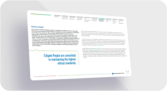 CONTENTS LETTER FROM NOEL WALLACE LETTER FROM ANN TRACY 2025 SUSTAINABILITY STRATEGY SUSTAINABILITY HIGHLIGHTS SUSTAINABILITY MANAGEMENT SUSTAINABILITY GOVERNANCE DRIVING SOCIAL IMPACT HELPING MILLIONS OF HOMES PRESERVING OUR ENVIRONMENT Business Integrity As we work to achieve Colgate’s purpose to reimagine a healthier future for all people, their pets and our planet, Colgate People working around the world share a commitment to our three core corporate values: Caring, Global Teamwork and Continuous Improvement. These values are reflected not only in the quality of our products and reputation, but also in our dedication to serving the communities where we live and work, as represented in our sustainability, social impact and DE&I strategies. With these values, we work to maintain a strong culture based on integrity, ethical behavior and a commitment to doing the right thing. Underlying these values and our strong culture is the commitment of all Colgate People to maintain the highest ethical standards and demonstrate ethical leadership, including compliance with Colgate policies and our Code of Ethics. Colgate People are committed to maintaining the highest ethical standards. We care about people: Colgate People, consumers, customers, stockholders, business partners and people in the communities where we live and work. We are committed to acting with compassion, integrity, honesty and high ethics in all situations and to providing our employees with an innovative and inclusive work environment. To further this goal, all our employees worldwide are required to annually certify that they understand and comply with the Code o f Conduct. In addition, our executives and key managers worldwide participate in training programs regarding the Code of Conduct, Colgate’s values, effective leadership and the applicable laws and regulations that govern our business practices around the world. Our directors also annually certify their compliance with the Code of Conduct . In 2021, Ethics and Compliance received 411 contacts through a variety of channels, including the EthicsLine, Ethics web tool and eth ics@colpal.com , which covered a wide variety of reporting activities including 60 consultations. A llegations reported to Ethics and Compliance are grouped into the following categories: Accounting-related, Conflict of Interest, Discrimination, Financial-related, Harassment, Regulatory/Legal, Retaliation, Work Environment, Miscellaneous Issues and non-Ethics and Compliance matters. After a thorough investigation has been completed, if the allegations are substantiated, appropriate remedial action is taken. PAGE 20 2021 SUSTAINABILITY AND SOCIAL IMPACT REPORT
