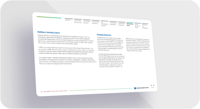 CONTENTS LETTER FROM NOEL WALLACE LETTER FROM ANN TRACY 2025 SUSTAINABILITY STRATEGY SUSTAINABILITY HIGHLIGHTS SUSTAINABILITY MANAGEMENT SUSTAINABILITY GOVERNANCE DRIVING SOCIAL IMPACT HELPING MILLIONS OF HOMES PRESERVING OUR ENVIRONMENT Building a Coaching Culture Ongoing coaching is a key element of our performance management process. In 2021, we continued our partnership with BetterUp, a leading provider of virtual coaching. BetterUp provided 495 Colgate leaders with personalized leadership training to accelerate their individual effectiveness and development. Not only do the participants experience high-quality coaching, they, in many cases, become champions of coaching within Colgate. In 2021, we continued offering the global learning program “Becoming a People Manager” that we launched in 2020. 187 ne w people managers completed the program, and we are committed to having all new and existing Colgate People managers participate and leverage this learning content to enable their teams to reach their full potential and perform at their best. Our ongoing Colgate Leadership Challenge for talented, early-in-career employees provides participants with exp osure and interaction with senior management, a greater understanding and connection to the global organization, personal leadership skills training and an opportunity to work on an important strategic issue for the business. Engaging Employees Colgate Connect is our global survey to assess key drivers of employee engagement. We also use shorter pulse surveys to gather more targeted and timely data at various moments of the employee journey—at the completion of the recruitment process, during the onboarding process and when leaving Colgate—to engage people and improve employee experience. This data has proven to be extremely valuable. From the 2018 Colgate Co nnect survey, we learned that our people wanted to learn more about career opportunities at Colgate. Our European team took the lead and used design thinking to create the “Build Your Best Future” program, which we activated globally in 2020 and continued this past year. During the COVID-19 pandemic, we deployed surveys to all employees, including in our manufacturing plan ts, to listen and adjust what we were doing in response to the pandemic. We have used the results from these surveys to amend our approach to hybrid- and remote-working scenarios and to guide our employees as they navigate the new working paradigm. We plan to deploy another Colgate Connect survey in 2022. PAGE 25 2021 SUSTAINABILITY AND SOCIAL IMPACT REPORT