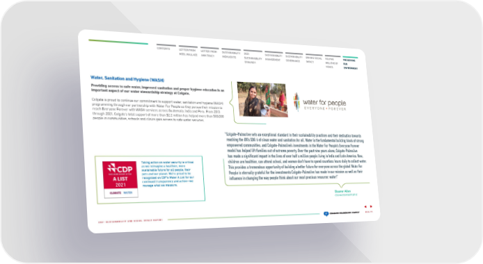CONTENTS LETTER FROM NOEL WALLACE LETTER FROM ANN TRACY 2025 SUSTAINABILITY STRATEGY SUSTAINABILITY HIGHLIGHTS SUSTAINABILITY MANAGEMENT SUSTAINABILITY GOVERNANCE DRIVING SOCIAL IMPACT HELPING MILLIONS OF HOMES PRESERVING OUR ENVIRONMENT Water, Sanitation and Hygiene (WASH) Providing access to safe water, improved sanitation and proper hygiene education is an important aspect of our water stewardship strategy at Colgate. Colgate is proud to continue our commitment to support water, sanitation and hygiene (WASH) programming through our partnership with Water For People as they pursue their mission to reach Everyone Forever with WASH services across Guatemala, India and Peru. From 2013 through 2021, Colgate's total support of more than $2.2 million has helped more than 500,000 people in communities, schools and clinics gain access to safe water services. Taking action on water security is critical as we reimagine a healthier, more sustainable future for all people, their pets and our planet. We’re proud to be recognized on CDP’s Water A List for our continued transparency and action—we manage what we measure. “Colgate-Palmolive sets an exceptional standard in their sustainability practices and their dedication towards reaching the UN’s SDG 6 of clean water and sanitation for all. Water is the fundamental building block of strong empowered communities, and Colgate-Palmolive’s investments in the Water For People’s Everyone Forever model has helped lift families out of extreme poverty. Over the past nine years alone, Colgate-Palmolive has made a significant impact in the lives of over half a million people living in India and Latin America. Now, children are healthier, can attend school, and women don’t have to spend countless hours daily to collect water. This provides a tremendous opportunity of building a better future for everyone across the globe! Water For People is eternally grateful for the investments Colgate-Palmolive has made in our mission as well as their influence in changing the way people think about our most precious resource: water!” Eleanor Allen CEO WATER FOR PEOPLE PAGE 77 2021 SUSTAINABILITY AND SOCIAL IMPACT REPORT