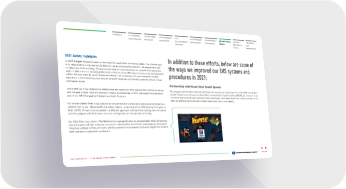 CONTENTS LETTER FROM LETTER FROM SUSTAINABILITY 2025 SUSTAINABILITY SUSTAINABILITY DRIVING SOCIAL HELPING PRESERVING NOEL WALLACE ANN TRACY HIGHLIGHTS SUSTAINABILITY MANAGEMENT GOVERNANCE IMPACT MILLIONS OF OUR STRATEGY HOMES ENVIRONMENT 2021 Safety Highlights In addition to these efforts, below are some of In 2021, Colgate People focused on learning from each other to improve safety. The ultimate goal is to reduce serious injuries and, to that end, we emphasized the need for risk assessment and the ways we improved our EHS systems and mindfulness while working. We also delved deep to understand how our people think about the ways in which work is actually performed so that we could offer ways to ensure we operationalize safety. We took pains to avoid “blame and shame,” as we believe it is more impactful to offer procedures in 2021: education, understand how and why an incident happened and identify plans to ensure it does not happen again. Partnership with Mount Sinai Health System In the past, we have emphasized establishing and communicating appropriate controls to reduce We engaged with the Mount Sinai Health System to stay abreast of developments with COVID-19 and other and mitigate critical risks and serious incidents and fatalities. In 2021, we made this expectation health-related issues of concern. Mount Sinai communicates regularly with our ECMT and members of our part of our EHS Management System and Audit Program. EHS team and hosts periodic webinars where participants can suggest topics and submit questions. It has been an effective way to educate Colgate People about how to stay healthy. Our annual Safety Week is typically an all-inclusive event to share best practices and refresh our commitment to our robust health and safety culture—a key tenet of our EHS Guiding Principles. In 2021, COVID-19 restrictions resulted in a different approach, with each site holding their own set of activities aligned with their own culture to reinvigorate our shared value of caring. Our Hill’s Etten-Leur plant in The Netherlands used gamification to activate Safety Week. Employees created a personal hero avatar to compete in safety battles to test their knowledge on emergency response, engage in treasure hunts, identify potential improvements and work together to create a safer and more sustainable workplace. 2021 SUSTAINABILITY AND SOCIAL IMPACT REPORT PAGE 30