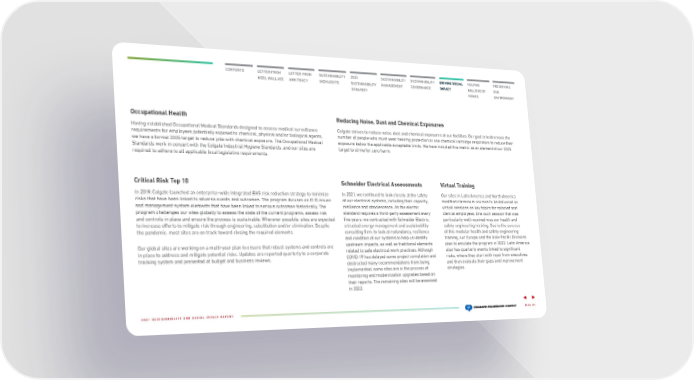 CONTENTS LETTER FROM LETTER FROM SUSTAINABILITY 2025 SUSTAINABILITY SUSTAINABILITY DRIVING SOCIAL HELPING PRESERVING NOEL WALLACE ANN TRACY HIGHLIGHTS SUSTAINABILITY MANAGEMENT GOVERNANCE IMPACT MILLIONS OF OUR STRATEGY HOMES ENVIRONMENT Occupational Health Reducing Noise, Dust and Chemical Exposures Having established Occupational Medical Standards designed to assess medical surveillance Colgate strives to reduce noise, dust and chemical exposures at our facilities. Our goal is to decrease the requirements for employees potentially exposed to chemical, physical and/or biological agents, number of people who must wear hearing protection or use chemical cartridge respirators to reduce their we have a formal 2025 target to reduce jobs with chemical exposure. The Occupational Medical exposure below the applicable acceptable limits. We have included this metric as an element of our 2025 Standards work in concert with the Colgate Industrial Hygiene Standards, and our sites are target to strive for zero harm. required to adhere to all applicable local legislative requirements. Critical Risk Top 10 Schneider Electrical Assessments Virtual Training In 2019, Colgate launched an enterprise-wide integrated EHS risk reduction strategy to minimize In 2021, we continued to look closely at the safety Our sites in Latin America and North America risks that have been linked to adverse events and outcomes. The program focuses on EHS issues of our electrical systems, including their capacity, modified classroom courses to be delivered as and management system elements that have been linked to serious outcomes historically. The resilience and obsolescence. As the electric virtual sessions on key topics for salaried and program challenges our sites globally to assess the state of the current programs, assess risk standard requires a third-party assessment every clerical employees. One such session that was and controls in place and ensure the process is sustainable. Wherever possible, sites are expected five years, we contracted with Schneider Electric, particularly well received was our health and to increase efforts to mitigate risk through engineering, substitution and/or elimination. Despite a trusted energy management and sustainability safety engineering training. Due to the success the pandemic, most sites are on track toward closing the required elements. consulting firm, to look at redundancy, resilience of this modular health and safety engineering and condition of our systems to help us identify training, our Europe and the Asia-Pacific Divisions Our global sites are working on a multi-year plan to ensure that robust systems and controls are upstream impacts, as well as traditional elements plan to emulate the program in 2022. Latin America in place to address and mitigate potential risks. Updates are reported quarterly to a corporate related to safe electrical work practices. Although also has quarterly events linked to significant tracking system and presented at budget and business reviews. COVID-19 has delayed some project completion and risks, where they start with input from executives obstructed many recommendations from being and then evaluate their gaps and improvement implemented, some sites are in the process of strategies. monitoring and modernization upgrades based on their reports. The remaining sites will be assessed in 2022. 2021 SUSTAINABILITY AND SOCIAL IMPACT REPORT PAGE 31