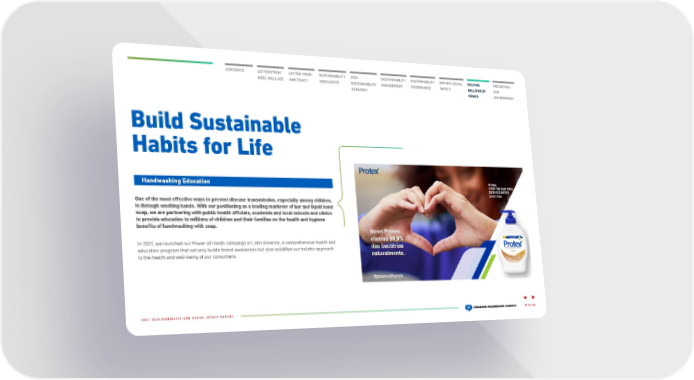 CONTENTS LETTER FROM LETTER FROM SUSTAINABILITY 2025 SUSTAINABILITY SUSTAINABILITY DRIVING SOCIAL HELPING PRESERVING NOEL WALLACE ANN TRACY HIGHLIGHTS SUSTAINABILITY MANAGEMENT GOVERNANCE IMPACT MILLIONS OF OUR STRATEGY HOMES ENVIRONMENT Build Sustainable Habits for Life Handwashing Education One of the most effective ways to prevent disease transmission, especially among children, is through washing hands. With our positioning as a leading marketer of bar and liquid hand soap, we are partnering with public health officials, academia and local schools and clinics to provide education to millions of children and their families on the health and hygiene benefits of handwashing with soap. In 2021, we launched our Power of Hands campaign in Latin America, a comprehensive health and education program that not only builds brand awareness but also solidifies our holistic approach to the health and well-being of our consumers. 2021 SUSTAINABILITY AND SOCIAL IMPACT REPORT PAGE 48