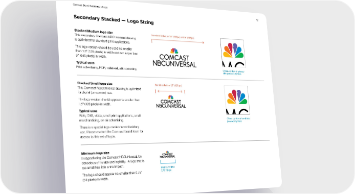 12 Comcast Brand Guidelines > Logo Stacked Medium logo size This secondary Comcast NBCUniversal drawing is optimized for standard print applications. This logo version should be used no smaller tha n 1.5 " (108 pixels) in width and not larger than 9 " (648 pixels) in width. Typical uses Print advertising, POP, collateral, silk screening. Stacked Small logo size This Comcast NBCUniversal drawing is optimized for digital (on-screen) use. The logo version should appear no smaller than 1.5 " (108 pixels) in width. Typical uses Web, DVD, video, small print applications, small merchandising, on-air advertising. There is a special logo version for embroidery use. Please contact the Comcast brand team for access to this set of logos. Minimum logo size In reproducing the Comcast NBCUniversal, be conscious of its size and legibility. A logo that is too small has little or no impact. The logo should appear no smaller than 0.75" (54 pixels) in width. Secondary Stacked — Logo Sizing For sizes below 1.5" (108 px) For sizes between 1.5" (108px) and 9" (648px) Minimum size: 0.75"/54px Close-up view of primary size peacock symbol. Close-up view of small size peacock symbol.