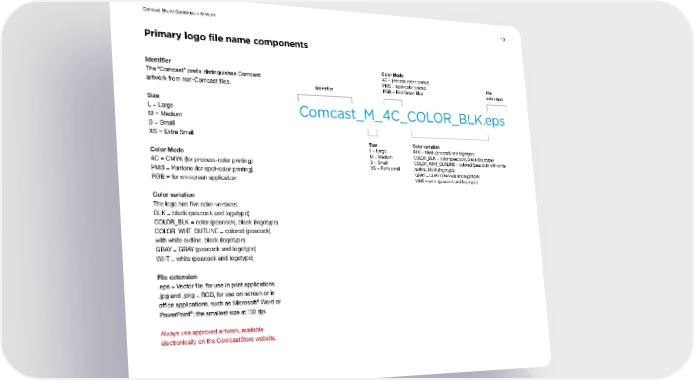 19 Identifier The “Comcast” prefix distinguishes Comcast artwork from non-Comcast files. Size L = Large M = Medium S = Small XS = Extra Small Color Mode 4C = CMYK (for process-color printing) PMS = Pantone (for spot-color printing) RGB = for on-screen application Color variation The logo has five color versions: BLK = black (peacock and logotype) COLOR_BLK = color (peacock), black (logotype) COLOR_WHT_OUTLINE = colored (peacock) with white outline, black (logotype). GRAY = GRAY (peacock and logotype) WHT = white (peacock and logotype) File extension .eps = Vector file, for use in print applications .jpg and .png = RGB, for use on-screen or in office applications, such as Microsoft ® Word or PowerPoint ® ; the smallest size at 150 dpi. Always use approved artwork, available electronically on the ComcastStore website. Primary logo file name components Comcast Brand Guidelines > Artwork Comcast_M_4C_COLOR_BLK.eps Color Mode 4C = process-color coated PMS = spot-color coated RGB = Red Green Blue Size L = Large M = Medium S = Small XS = Extra small Color variation BLK = black (peacock and logotype) COLOR_BLK = color (peacock), black (logotype) COLOR_WHT_OUTLINE = colored (peacock) with white outline, black (logotype) GRAY = GRAY (peacock and logotype) WHT = white (peacock and logotype) Identifier File extension