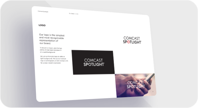 LOGO Our logo is the simplest and most recognizable representation of our brand. To ensure its impact, give the logo plenty of clear space and place it on a quiet background. We use our full-color logo on white or light backgrounds. We use our reversed logo on photography or dark backgrounds for a clean, modern expression. Our Brand | V 1.0 Comcast Spotlight 24