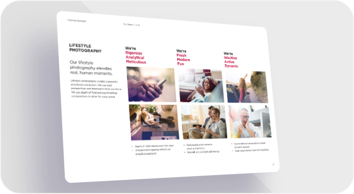 LIFESTYLE PHOTOGRAPHY Our lifestyle photography elevates real, human moments. Lifestyle photography creates a powerful emotional connection. We use bold perspectives and framing to show our focus. We use depth of field and asymmetrical compositions to allow for copy space. Depth of field creates room for copy. Unexpected cropping reflects our analytical approach. Real people and moments show authenticity. Warmth and sunlight add energy. Asymmetrical compositions create dynamic layouts. Copy space leaves room for headlines. Were Rigorous Analytical Meticulous Were Fresh Modern Fun Were Intuitive Active Dynamic 27 Our Brand | V 1.0 Comcast Spotlight