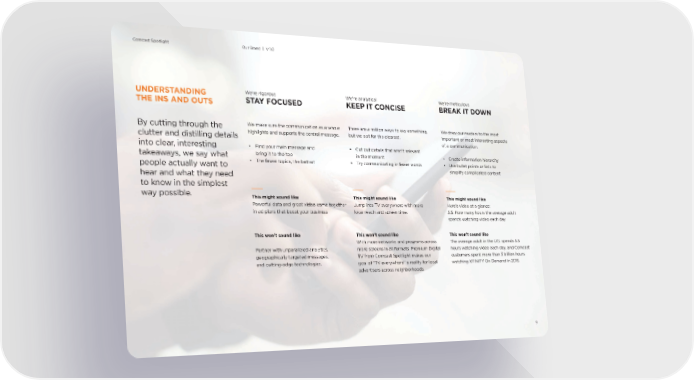 UNDERSTANDING THE INS AND OUTS By cutting through the clutter and distilling details into clear, interesting takeaways, we say what people actually want to hear and what they need to know in the simplest way possible. Were rigorous STAY FOCUSED We make sure the communication as a whole highlights and supports the central message. Find your main message and bring it to the top The fewer topics, the better! This might sound like Powerful data and great video come together in ad plans that boost your business. This wont sound like Partner with unparalleled analytics, geographically targeted messages, and cutting-edge technologies. This might sound like Jump into TV everywhere with more local reach and screen time. This wont sound like With more networks and programs across more screens in all formats, Premium Digital TV from Comcast Spotlight makes our goal of TV everywhere a reality for local advertisers across neighborhoods. This might sound like Heres video at a glance: 5.5: How many hours the average adult spends watching video each day This wont sound like The average adult in the U.S. spends 5.5 hours watching video each day, and Comcast customers spent more than 3 billion hours watching XFINITY On Demand in 2015. Were analytical KEEP IT CONCISE There are a million ways to say something, but we opt for the clearest. Cut out details that arent relevant in the moment Try communicating in fewer words Were meticulous BREAK IT DOWN We draw our readers to the most important or most interesting aspects of a communication. Create information hierarchy Use bullet points or lists to simplify complicated content 9 Our Brand | V 1.0 Comcast Spotlight