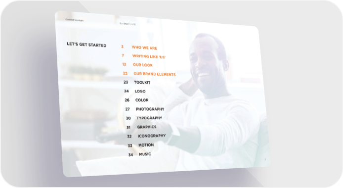 3 7 12 22 23 24 26 27 30 31 32 33 34 WHO WE ARE WRITING LIKE US OUR LOOK OUR BRAND ELEMENTS TOOLKIT LOGO COLOR PHOTOGRAPHY TYPOGRAPHY GRAPHICS ICONOGRAPHY MOTION MUSIC LETS GET STARTED 2 Our Brand | V 1.0 Comcast Spotlight