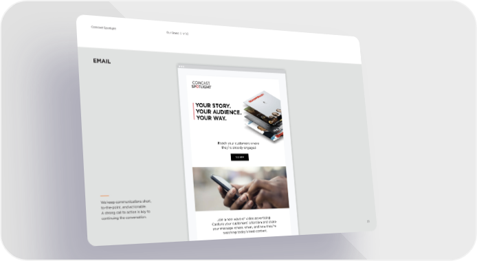 EMAIL fi SEE HOW YOUR STORY. YOUR AUDIENCE. YOUR WAY. We keep communications short, to-the-point, and actionable. A strong call to action is key to continuing the conversation. 20 Our Brand | V 1.0 Comcast Spotlight