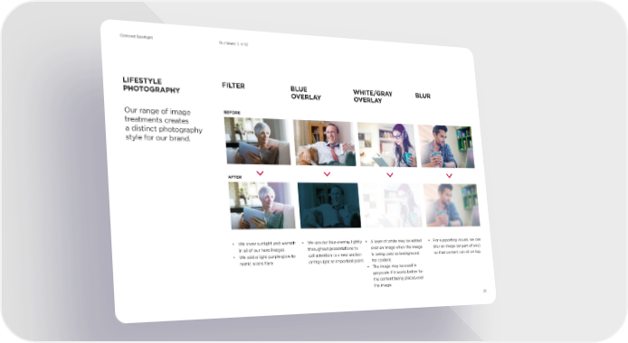 LIFESTYLE PHOTOGRAPHY Our range of image treatments creates a distinct photography style for our brand. We show sunlight and warmth in all of our hero images. We add a light purple glow to mimic a lens flare. We use our blue overlay lightly throughout presentations to call attention to a new section or highlight an important point. A layer of white may be added over an image when the image is being used as background for content. The image may be used in grayscale if it works better for the content being placed over the image. For supporting visuals, we can blur an image (or part of one) so that content can sit on top. FILTER BLUE OVERLAY WHITE/GRAY OVERLAY BLUR AFTER BEFORE 28 Our Brand | V 1.0 Comcast Spotlight