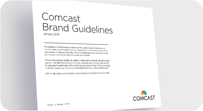 Comcast Brand Guidelines Version 1.3 January 17, 2013 January 2013 The acquisition of NBCUniversal, combined with the continued growth and success of Comcast Cable, has transformed Comcast Corporation into a Fortune 50 company at the cross section of media and technology. This new brand identity better reflects who we are as a company today and the direction in which we are headed. The new Comcast logo combines an updated, modern look for Comcast with NBC’s iconic peacock. This will be the new logo for Comcast Corporation and Comcast Cable, and will be used going forward in place of the current Comcast crescent C logo. There is no change to the NBCUniversal logo or to the many identifiable brands that comprise NBCUniversal. XFINITY will continue to be the primary customer-facing service brand for Comcast Cable.
