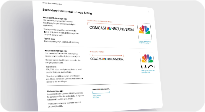 10 Comcast Brand Guidelines > Logo Horizontal Medium logo size This secondary Comcast NBCUniversal logo drawing is optimized for standard print applications. This logo version should be used no smaller than 3 " (216 pixels) in width and not larger than 18 " (1296 pixels) in width. Typical uses Print advertising, POP, collateral, silk screening. Horizontal Small logo size This secondary Comcast NBCUniversal logo drawing is optimized for digital (on-screen) use. The logo version should appear no smaller than 0.5 " (36 pixels) in width. Typical uses Web, DVD, video, small print applications, small merchandising, on-air advertising. There is a special logo version for embroidery use. Please contact the Comcast brand team for access to this set of logos. Minimum logo size In reproducing the Comcast NBCUniversal logo, be conscious of its size and legibility. A logo that is too small has little or no impact. The logo should appear no smaller than 0.5" (36 pixels) in width. Secondary Horizontal — Logo Sizing For sizes below 3" (216px) For sizes between 3" (216px) and 18" (1296px) Minimum size: 1.5"/108px Close-up view of primary size peacock symbol. Close-up view of small size peacock symbol.