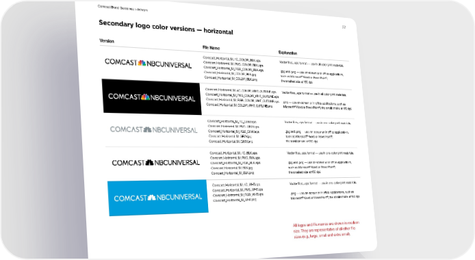 22 Comcast Brand Guidelines > Artwork Secondary logo color versions — horizontal Version File Name Explanation Comcast_Horizontal_M_4C_COLOR_BLK.eps Comcast_Horizontal_M_PMS_COLOR_BLK.eps Comcast_Horizontal_M_RGB_COLOR_BLK.eps Comcast_Horizontal_M_COLOR_BLK.jpg Comcast_Horizontal_M_COLOR_BLK.png Comcast_Horizontal_M_4C_BLK.eps Comcast_Horizontal_M_PMS_BLK.eps Comcast_Horizontal_M_RGB_BLK.eps Comcast_Horizontal_M_BLK.jpg Comcast_Horizontal_M_BLK.png Comcast_Horizontal_M_4C_WHT.eps Comcast_Horizontal_M_PMS_WHT.eps Comcast_Horizontal_M_RGB_WHT.eps Comcast_Horizontal_M_WHT.png Comcast_Horizontal_M_4C_COLOR_WHT_OUTLINE.eps Comcast_Horizontal_M_PMS_COLOR_WHT_OUTLINE.eps Comcast_Horizontal_M_RGB_COLOR_WHT_OUTLINE.eps Comcast_Horizontal_M_COLOR_WHT_OUTLINE.png Comcast_Horizontal_M_4C_GRAY.eps Comcast_Horizontal_M_PMS_GRAY.eps Comcast_Horizontal_M_RGB_GRAY.eps Comcast_Horizontal_M_GRAY.jpg Comcast_Horizontal_M_GRAY.png Vector files, .eps format — use in all color print materials. .jpg and .png — use on-screen or in office applications, such as Microsoft ® Word or PowerPoint ® ; the smallest size at 150 dpi. Vector files, .eps format — use in one-color print materials. .jpg and .png — use on-screen or in office applications, such as Microsoft ® Word or PowerPoint ® ; the smallest size at 150 dpi. Vector files, .eps format — use in one-color print materials. .png — use on-screen or in office applications, such as Microsoft ® Word or PowerPoint ® ; the smallest size at 150 dpi. Vector files, .eps format — use in all color print materials. .png — use on-screen or in office applications, such as Microsoft ® Word or PowerPoint ® ; the smallest size at 150 dpi. Vector files, .eps format — use in one-color print materials. .jpg and .png — use on-screen or in office applications, such as Microsoft ® Word or PowerPoint ® ; the smallest size at 150 dpi. All logos and file names are shown in medium size. They are representative of all other file sizes (e.g., large, small and extra small).