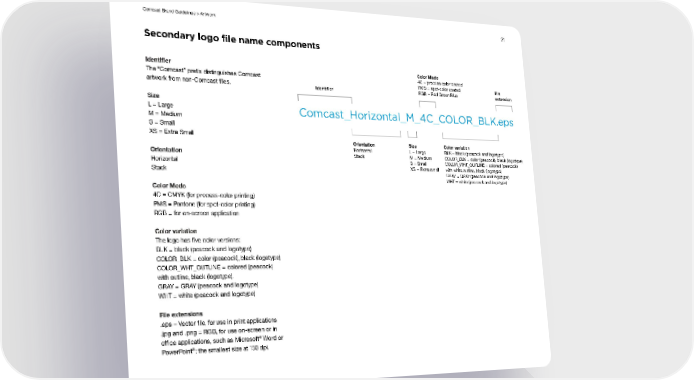 21 Secondary logo file name components Identifier The “Comcast” prefix distinguishes Comcast artwork from non-Comcast files. Size L = Large M = Medium S = Small XS = Extra Small Orientation Horizontal Stack Color Mode 4C = CMYK (for process-color printing) PMS = Pantone (for spot-color printing) RGB = for on-screen application Color variation The logo has five color versions: BLK = black (peacock and logotype) COLOR_BLK = color (peacock), black (logotype) COLOR_WHT_OUTLINE = colored (peacock) with outline, black (logotype). GRAY = GRAY (peacock and logotype) WHT = white (peacock and logotype) File extensions .eps = Vector file, for use in print applications .jpg and .png = RGB, for use on-screen or in office applications, such as Microsoft ® Word or PowerPoint ® ; the smallest size at 150 dpi. Comcast Brand Guidelines > Artwork Comcast_Horizontal_M_4C_COLOR_BLK.eps Orientation Horizontal Stack Color Mode 4C = process-color coated PMS = spot-color coated RGB = Red Green Blue Size L = Large M = Medium S = Small XS = Extra small Color variation BLK = black (peacock and logotype) COLOR_BLK = color (peacock), black (logotype) COLOR_WHT_OUTLINE = colored (peacock) with white outline, black (logotype) GRAY = GRAY (peacock and logotype) WHT = white (peacock and logotype) Identifier File extension