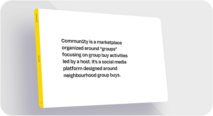 Commun1ty Commun1ty is a marketplace organized around “groups” focusing on group buy activities Branding led by a host. It’s a social media platform designed around neighbourhood group buys. 2