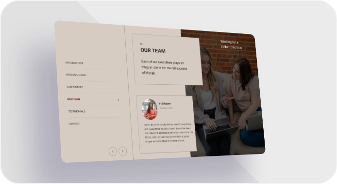 Working for a better tomorrow 04 OUR TEAM Each of our executives plays an INTRODUCTION integral role in the overall success of Monak. MISSION & VISION CASE STUDIES OUR TEAM Full Name President & CEO TESTIMONIALS CONTACT Lorem Ipsum is simply dummy text of the printing and typesetting industry. Lorem Ipsum has been the industry's standard dummy text ever since the 1500s, when an unknown printer took a galley of type and scrambled it to make a book.