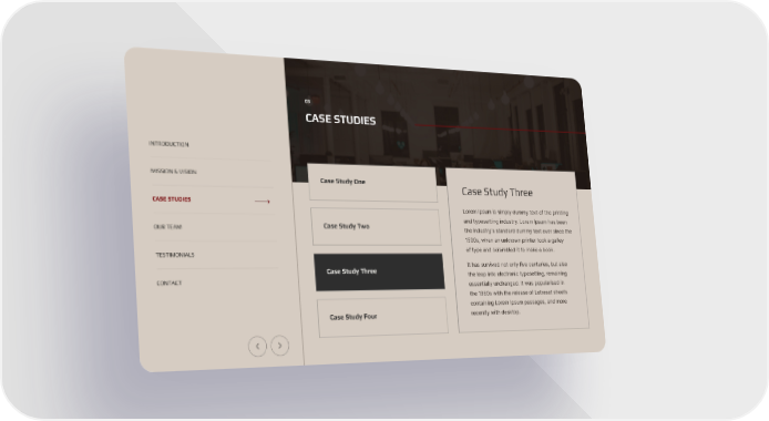 03 CASE STUDIES INTRODUCTION MISSION & VISION Case Study One Case Study Three CASE STUDIES Lorem Ipsum is simply dummy text of the printing and typesetting industry. Lorem Ipsum has been Case Study Two OUR TEAM the industry's standard dummy text ever since the 1500s, when an unknown printer took a galley of type and scrambled it to make a book. TESTIMONIALS It has survived not only five centuries, but also Case Study Three the leap into electronic typesetting, remaining CONTACT essentially unchanged. It was popularised in the 1960s with the release of Letraset sheets containing Lorem Ipsum passages, and more recently with desktop. Case Study Four