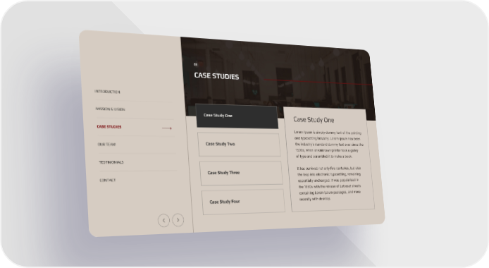 03 CASE STUDIES INTRODUCTION MISSION & VISION Case Study One Case Study One CASE STUDIES Lorem Ipsum is simply dummy text of the printing and typesetting industry. Lorem Ipsum has been the industry's standard dummy text ever since the Case Study Two OUR TEAM 1500s, when an unknown printer took a galley of type and scrambled it to make a book. TESTIMONIALS It has survived not only five centuries, but also Case Study Three the leap into electronic typesetting, remaining CONTACT essentially unchanged. It was popularised in the 1960s with the release of Letraset sheets containing Lorem Ipsum passages, and more recently with desktop. Case Study Four