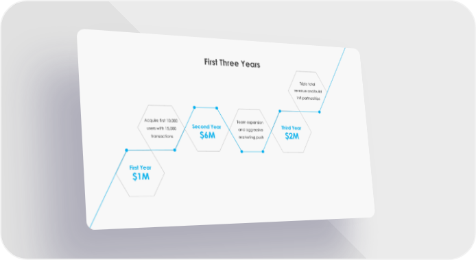 First Three Years Triple total revenue and build intl partnerships Acquire first 10,000 Team expansion Second Year Third Year users with 15,000 and aggressive transactions $6M $2M marketing push First Year $1M