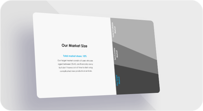 10B Market Total Available Our Market Size 7B Total market share: 10% Market Serviceable Our target market consists of users who are aged between 25-45, are financially savvy but don’t have a lot of time to start using complicated new products or services. 3B Market Our Target