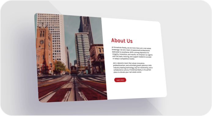 Learn more About Us At PrimeVista Realty, we are more than just a real estate brokerage—we are a team of passionate professionals dedicated to excellence. With a strong reputation for integrity, innovation, and results, we empower our agents with the tools, training, and support needed to succeed in today’s competitive market. Join a dynamic team that values innovation, professionalism, and unlimited growth potential. With industry-leading technology, top-tier mentorship, and a collaborative culture, PrimeVista Realty is the perfect place to elevate your real estate career.