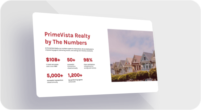 PrimeVista Realty by The Numbers At PrimeVista Realty, our numbers speak for themselves. We are dedicated to empowering agents, delivering results, and setting new industry standards. in total real estate sales since 1990 $10B+ successful transactions closed annually 50+ client satisfaction rating based on surveys and reviews 98% successful transactions closed annually 5,000+ top-performing agents nationwide 1,200+