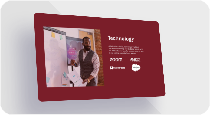 Company Profile Presentation Page 8 Page 10Technology At PrimeVista Realty, we leverage the latest, real-world technology to provide our agents with the most effective tools for success. Here’s a look at the cutting-edge platforms we use: