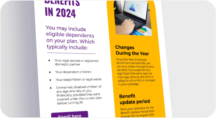 ENROLLMENT FOR YOUR BENEFITS IN 2024 You may include eligible dependents on your plan. Which Changes typically include: During the Year Once the New Employee ● Your legal spouse or registered enrollment period ends, you domestic partner can only make changes to your benefits if you experience a ● Your dependent children significant life event, such as marriage, divorce, the birth or ● Your stepchildren or legal wards adoption of a child, or changes in your coverage. ● Unmarried, disabled children of any age who rely on you financially, provided they were covered under the current plan Benefit before turning 25. update period Mark your calendars for the Benefit Update Period from Enroll here August 15th to August 25th. This is your chance to review and select your benefits for the upcoming year. Please ensure you make your selections carefully as your chosen benefits will take effect on September 1st, 2024. 6