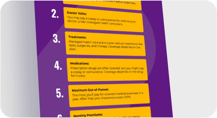 Deductible: The amount you pay out-of-pocket before your 1. insurance starts paying for covered medical expenses. Doctor Visits: You may pay a copay or coinsurance for visits to your 2. doctor under managed health care plans. Treatments: Managed health care plans cover various treatments like 3. tests, surgeries, and therapy. Coverage depends on the plan. Medications: Prescription drugs are often covered, but you might pay 4. a copay or coinsurance. Coverage depends on the drug formulary. Maximum Out-of-Pocket: The most you'll pay for covered medical expenses in a 5. year. After that, your insurance covers 100%. Monthly Premiums: Your fixed monthly payment for health insurance 6. coverage. 9