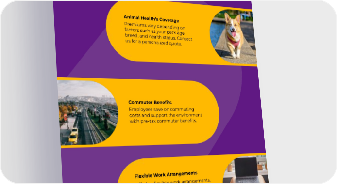 SUPPLEMENTARY PERKS Animal Health’s Coverage Premiums vary depending on factors such as your pet's age, breed, and health status. Contact us for a personalized quote. Commuter Benefits Employees save on commuting costs and support the environment with pre-tax commuter benefits. Flexible Work Arrangements Offering flexible work arrangements, such as remote work options, flexible hours, or compressed workweeks, provides employees with greater work-life balance and autonomy. 19
