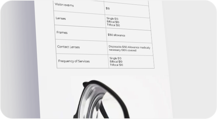 Eye Care Plan Individual $2,000 Deductible Family $4,000 $10 Vision exams Single $10 Bifocal $10 Lenses Trifocal $10 $150 allowance Frames Disposable $150 Allowance medically Contact Lenses necessary 100% covered Single $10 Bifocal $10 Frequency of Services Trifocal $10 15