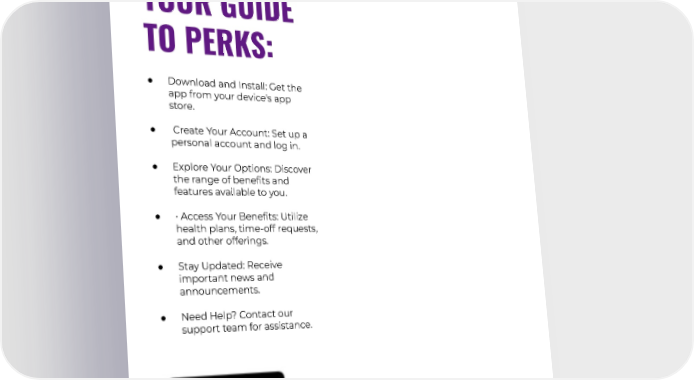 HOW TO ACCESS YOUR GUIDE TO PERKS: ● Download and Install: Get the app from your device's app store. ● Create Your Account: Set up a personal account and log in. ● Explore Your Options: Discover the range of benefits and features available to you. ● • Access Your Benefits: Utilize health plans, time-off requests, and other offerings. ● Stay Updated: Receive important news and announcements. ● Need Help? Contact our support team for assistance. 5