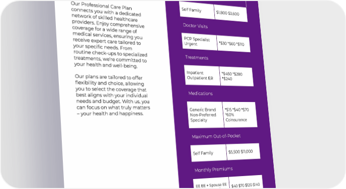 Professional Core Pro Care Plans Self Family $1,800 $3,600 Our Professional Care Plan connects you with a dedicated network of skilled healthcare Doctor Visits providers. Enjoy comprehensive coverage for a wide range of PCP Specialist medical services, ensuring you *$30 *$60 *$110 Urgent receive expert care tailored to your specific needs. From routine check-ups to specialized Treatments treatments, we're committed to your health and well-being. Inpatient *$450 *$280 Outpatient ER *$240 Our plans are tailored to offer flexibility and choice, allowing you to select the coverage that Medications best aligns with your individual needs and budget. With us, you can focus on what truly matters Generic Brand *$15 *$40 *$70 – your health and happiness. Non-Preferred *60% Specialty Coinsurance Maximum Out-of-Pocket Self Family $5,500 $11,000 Monthly Premiums EE EE + Spouse EE $40 $70 $120 $140 + Dep(s) EE + Fam 13