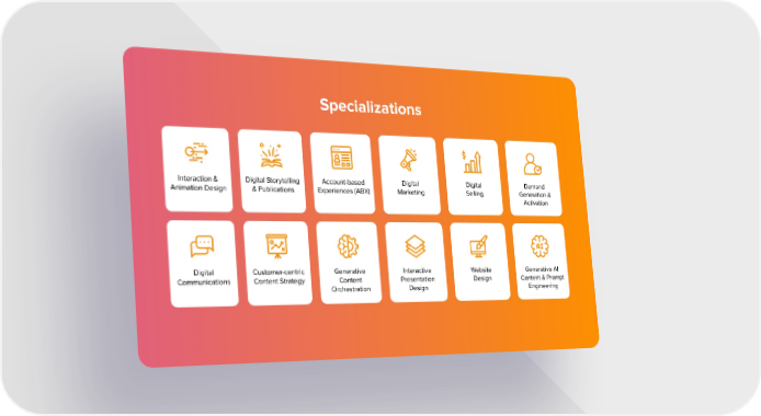 Specializations Interaction & Digital Storytelling Account-based Digital Digital Demand Animation Design & Publications Experiences (ABX) Marketing Selling Generation & Activation Digital Customer-centric Generative Interactive Website Generative AI Communications Content Strategy Content Presentation Design Content & Prompt Orchestration Design Engineering