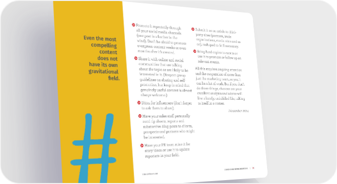 Promote it repeatedly through Submit it as an article to third- all your social media channels party sites (partners, trade (one post is a feather in the organizations, media sites and so Even the most wind). Don’t be afraid to promote on), reshaped to fit if necessary. compelling evergreen content weeks or even Bring hard copies to events or content months after it’s created. use it to promote or follow up on does not Share it with online and social relevant events. have its own communities that are talking All this requires ongoing attention gravitational about the topic or are likely to be and the cooperation of more than interested in it. (Respect group just the marketing team, so yes, it field. guidelines on sharing and self- can be a lot of work. But if you don’t promotion, but keep in mind that do these things, chances are your genuinely useful content is almost excellent analysis and advice will always welcome.) live a lonely, unfulfilled life, talking Ditto, for influencers (don’t forget to itself in a corner. to ask them to share). November 2014 Have your sales staff personally send tip sheets, reports and substantive blog posts to clients, prospects and partners who might be interested. Have your PR team mine it for story ideas or use it to update reporters in your field. thinkshiftcom.com | Content marketing manifesto | 15