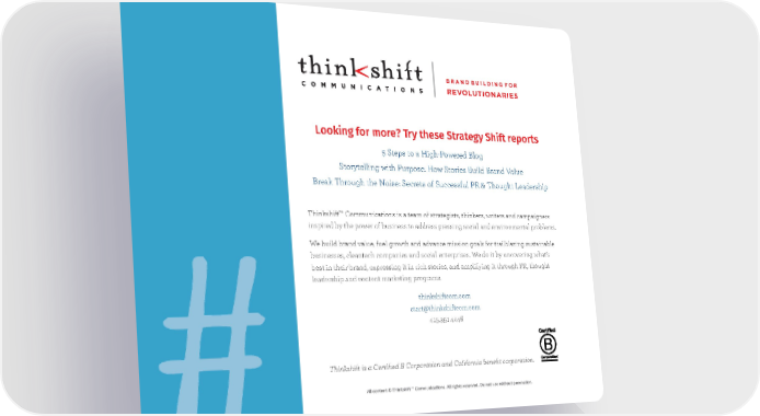 Brand Building for revolutionaries Looking for more? Try these Strategy Shift reports 5 Steps to a High-Powered Blog Storytelling with Purpose: How Stories Build Brand Value Break Through the Noise: Secrets of Successful PR & Thought Leadership Thinkshift™ Communications is a team of strategists, thinkers, writers and campaigners inspired by the power of business to address pressing social and environmental problems. We build brand value, fuel growth and advance mission goals for trailblazing sustainable businesses, cleantech companies and social enterprises. We do it by uncovering what’s best in their brand, expressing it in rich stories, and amplifying it through PR, thought leadership and content marketing programs. thinkshiftcom.com start@thinkshiftcom.com 415.391.4446 Thinkshift is a Certified B Corporation and California benefit corporation. all content © thinkshift™ Communications. all rights reserved. Do not use without permission.