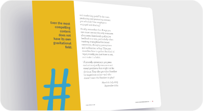 and marketing goals? Is the team producing and promoting content per schedule? Are employees Even the most engaged and sharing? compelling Finally, remember that things you content can count are not the only measures does not of success. Anecdotal, qualitative have its own feedback matters, particularly when gravitational tracking intangibles like brand awareness, changing perceptions field. and inclination to buy. This post describes how to gather that kind of input; mostly, you just have to ask, and make it a habit. Ultimately, systematic progress evaluations justify resources and reveal problems that might not be obvious. They also provide a baseline for experimentation—and who doesn’t want the freedom to play? March & July 2015 September 2014 thinkshiftcom.com | Content marketing manifesto | 18