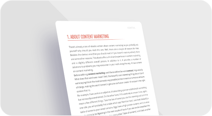 1. ABOUT CONTENT MARKETING There’s already a ton of ebooks written about content marketing so you probably ask yourself why should you read this one. Well, there are a couple of reasons for that. Besides the obvious one (that you should read it if you haven’t read any other), there are some other reasons. This ebook offers a firsthand experience in content marketing and a slightly different overall picture. In addition to it, it provides a number of solutions to problems you may encounter in your work along the way. A true content on content marketing. Before defining content marketing, we’d like to define the word content, linguistically. What does that word even mean? Well, the beautiful and interesting thing about it (and we’re saying this in the most sarcastic way possible) is that it means a numerous amount of things, making the word ‘content’ a genuine confusion creator (if not put in the right context that is). For example, if we use it as an adjective, it’s describing a person satisfied with something but not exactly overwhelmed. On the other hand, if it’s used only as a noun, it can, again, mean a few different things. Take the box of cereal you ate this morning and turn it to one side, you will probably find a table which says ‘Nutrition facts’, and that’s basically a table of contents your cereal contains. Eggs have a high protein content, and it is what you’re going to be digesting in the next couple of hours if you ate one for breakfast this morning. Also, the page before this one is titled ‘Table of contents’, and that’s another use of the word ‘content’ for you. CONTENT MARKETING 2.