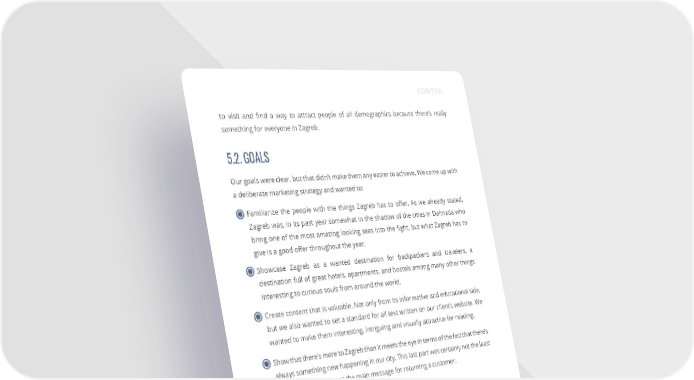 to visit and find a way to attract people of all demographics because there’s really something for everyone in Zagreb. 5.2. GOALS Our goals were clear, but that didn’t make them any easier to achieve. We came up with a deliberate marketing strategy and wanted to: Familiarize the people with the things Zagreb has to offer. As we already stated, Zagreb was, in its past year somewhat in the shadow of the cities in Dalmatia who bring one of the most amazing looking seas into the fight, but what Zagreb has to give is a good offer throughout the year. Showcase Zagreb as a wanted destination for backpackers and travelers, a destination full of great hotels, apartments, and hostels among many other things interesting to curious souls from around the world. Create content that is valuable. Not only from its informative and educational side, but we also wanted to set a standard for all text written on our client’s website. We wanted to make them interesting, intriguing and visually attractive for reading. Show that there’s more to Zagreb than it meets the eye in terms of the fact that there’s always something new happening in our city. This last part was certainly not the least important one, as it was the main message for returning a customer. 5.3. HOW DID WE ACHIEVE WHAT WE WANTED? Preparation - we always plan what it is that we’re going to write about. One of the most important things when writing this kind of blog is to keep up with the ever- changing trends and events. Research - after we’ve published our written blogs, our work isn’t finished. We want to make sure what topics were the most interesting ones so that we could keep delivering the most relatable content possible. Authentic Photographs - we invest in good photographic equipment so that we can fully evoke the stuff we are writing about with the high-quality photos. CASE STUDY: HOW TO PROMOTE A CITY WITH THE HELP OF CONTENT MARKETING AND BLOG WRITING? 35.