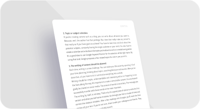 2. Topic or subject selection If you’re creating content such as a blog, you can write about whatever you want to. Because, well, the author has that privilege. But, does that really make any sense? Is that really so if you have goals to achieve? You have to take time and think about the potential subjects, constantly having the target audience on your mind. You also have to create a calendar and write down the topics you’re about to work on in the following period. It’s a good idea to use Google Keyword Planner for the selection of the right topics. By using that tool, Google proposes a few related topics for a term you punch in. 3. The writing of content should be planned Each time, writing is a new challenge. You can make your life easier by spending 1/3 of your time planning, thinking about topics, searching literature and sources. After you’ve done that, all you have to do is summarize everything into a whole. Writing should be simple, understandable and interesting while not forgetting to use the facts along the way. It’s important to create a remarkable content, the one that will gladly be shared on social media. The amount of words is secondary. The message you successfully transfer with those words is the most important. The writing, by itself, is not easy. That’s why it’s a good piece of advice to write the first version and allow yourself some mistakes. Go through your text a couple of times and correct the obvious mistakes. After a few readings and changes, you’ll reach the final version of your text. If you’re not sure, share it with your colleagues and friends. They might see some things you probably haven’t. CONTENT MARKETING 12.