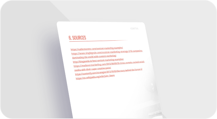 6. SOURCES https://optinmonster.com/content-marketing-examples/ https://www.singlegrain.com/content-marketing-strategy-2/16-companies- dominating-the-world-with-content-marketing/ http://blogpanda.io/best-content-marketing-examples/ https://madovermarketing.com/2015/06/09/20-times-zomato-rocked-social- media-with-their-super-creative-posts/ https://contently.com/strategist/2013/10/03/the-story-behind-the-furrow-2/ https://en.wikipedia.org/wiki/John_Deere SOURCES 37.