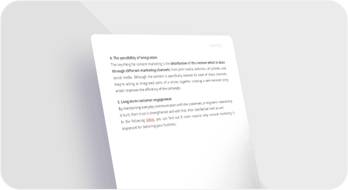 4. The possibility of integration The key thing for content marketing is the distribution of the content which is done through different marketing channels; from print media, websites, cell phones, and social media. Although the content is specifically created for each of these channels, they’re acting as integrated parts of a whole, together creating a well-rounded story which improves the efficiency of the campaign. 5. Long-term customer engagement By maintaining everyday communication with the customers, a long-term relationship is built, their trust is strengthened and with that, their satisfaction level as well. In the following video, you can find out 8 more reasons why content marketing is important for bettering your business. CONTENT MARKETING 10.