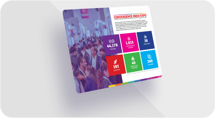 CONVERGENCE INDIA EXPO Convergence India expo is at the forefront of India’s ‘Digital Revolution’ and a hub for future technologies, innovation and everything that is ‘smart’ and ‘sustainable’. The expo is the go-to destination for trends in the fi elds of telecom & broadcast, IoT, IT solutions, cloud, big data & analytics, AI, mobiles & accessories, embedded tech, blockchain, fi ntech, digital gaming and much more. Convergence India provides an international platform for Indian industry to grow and emerge as a global leader. 44,170 1,015 36 VISITORS PARTICIPATING COUNTRIES BRANDS 182 40 200 STARTUPS CONFERENCE SPEAKERS SESSIONS th th Statistics for 30 Convergence India expo & 8 Smart Cities, held from 27-29 March 2023 at Pragati Maidan.